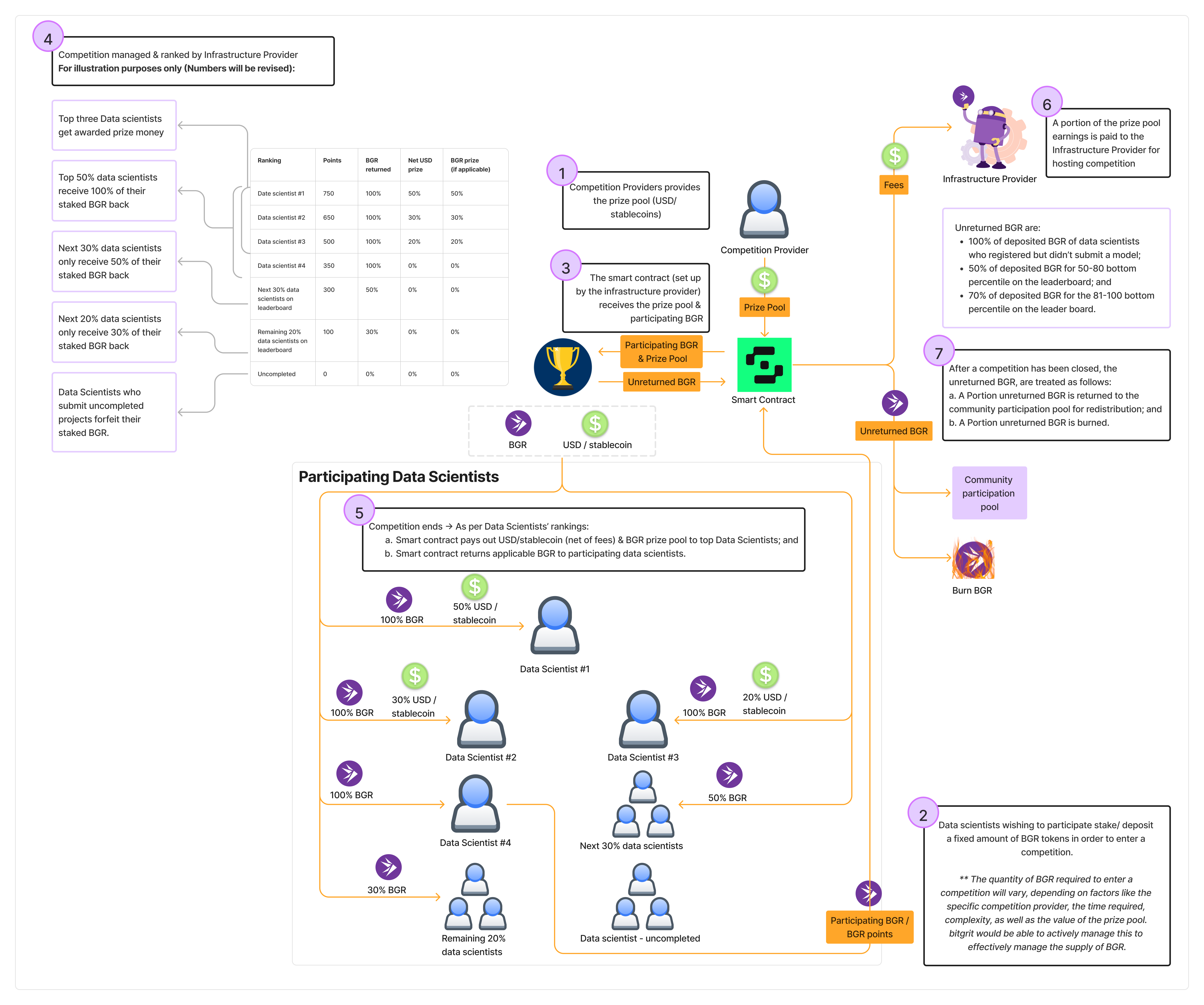 <figure><img src="https://2159235039-files.gitbook.io/~/files/v0/b/gitbook-x-prod.appspot.com/o/spaces%2FAVBmsBGFUUI9NL7w1jtV%2Fuploads%2FUAJfLzFyBPbWjIQPUT9D%2FBitgrit%20Tokenomics%20Framework%20(version%20F.4).png?alt=media&#x26;token=65574c6f-cc6a-4e36-8b01-703bf5ace9ca" alt=""><figcaption><p>Circulation of BGR through AI Competitions</p></figcaption></figure>